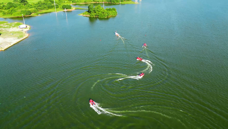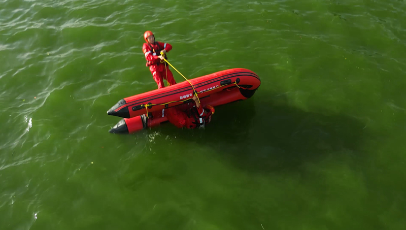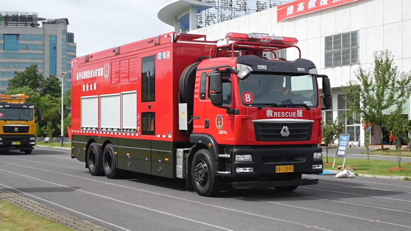 防汛演练模拟连日暴雨导致某小区地下车库被淹的情景。乐平队调集大型排水抢险车赶赴现场后, 有序布置水带、连接电缆,启动车载发电机组,对积水点开展大流量应急抽排。在水域救援演练中,队员们先后开展了舟艇编队行进、快速救援和翻船自救等演练科目。