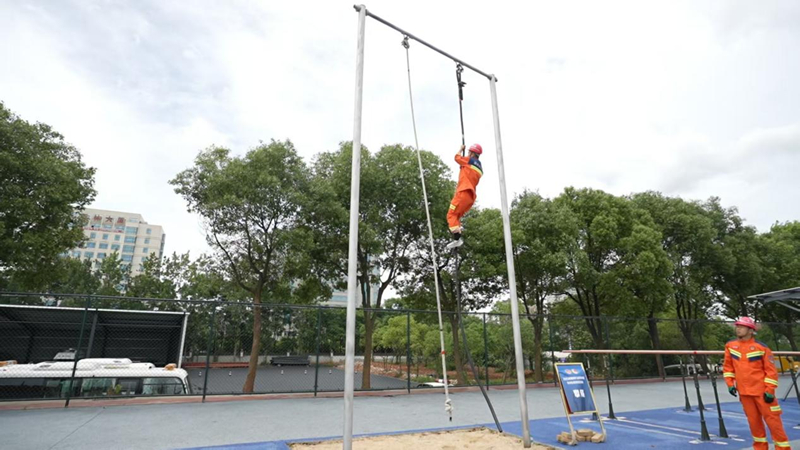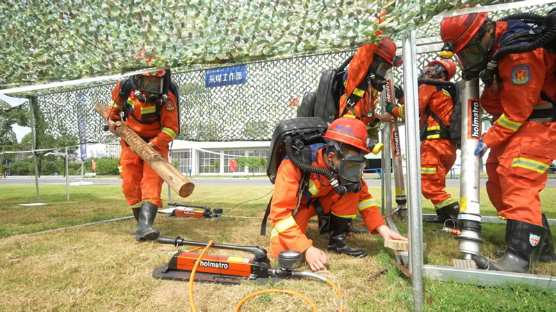 综合体能展示中,矿山救援队员完成绳索爬升、剪切救援操作、矮巷救援、翻轮胎操作、锯木料演示等高强度体能项目,展现了过硬的身体素质和心理素质,诠释“平时多流汗,战时少流血”的训练理念。
