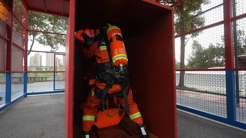 有限空间演练模拟了污水井清淤作业中1人失联、1人中毒昏迷的险情,11名救援人员运用通风机、三角架、五点式安全带等装备,成功实施井下通风、伤员固定及垂直提升救援,并对昏迷伤员进行心肺复苏,凸显狭小空间救援的专业性。