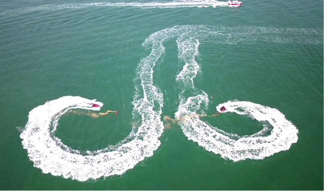 面对激流涌浪,冲锋舟在海面上画出6道“生命圆环”,展现出过硬的水域应急救援能力。