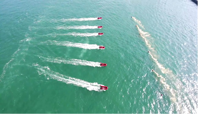 无人机利用高清和红外摄像头,快速搜寻被救目标,精准抛投救生圈。高速摩托艇如离弦之箭抵达现场,采取环形侦察方式,确定落水人员状态及水域安全后缓慢抵近,成功营救落水人员。