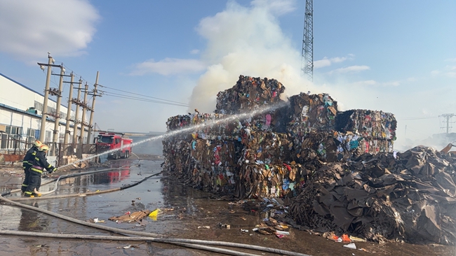 经侦察,现场燃烧面积达1200多平方米,无人员伤亡被困。燃烧物是叠摞在一起、高达3米的打包纸壳,给火灾扑救工作带来较大困难。经研判分析,指挥员立即下达救援指令:一组携一支19毫米直流水枪消灭纸垛东侧明火;二组携一支19毫米直流水枪消灭纸垛北侧明火;三组利用18米高喷消防车,对高处纸垛明火进行扑灭。经过4小时持续救援,明火和阴燃火被全部扑灭。