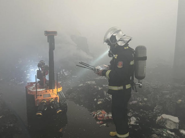 接警后,兰州石化队调派3台救援车辆,9名抢险救援人员携带专业装备火速抵达现场。经初步侦查,仓库内部烟气浓重、能见度极低,且存在大量固体可燃物,过火面积已接近800平方米。为确保安全救援、科学救援,兰州石化队果断利用消防机器人深入火场核心区域开展火情侦查,实时回传图像与环境数据,为现场指挥部科学决策提供关键支撑。