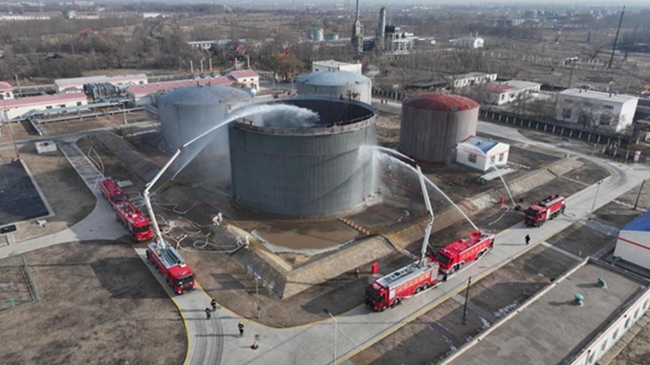 此次演练模拟大庆油田某联合站一储油罐因油品泄漏着火,引发罐顶全液面火灾,并形成地面大面积流淌火,对整个厂区装置构成严重威胁。