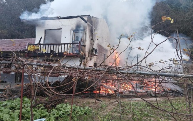 普光队克服山路蜿蜒陡峭等不利因素到达现场后,立即开展火情侦查,确认起火点位于房屋二楼杂物间。现场指挥员制定处置方案,划定警戒区域,有序疏散周围群众,同步实施断电安全保护,并转移屋内液化气罐等易燃易爆危险品。队员们快速布设两组消防水带,分别从窗户、大门突进,精准开展喷射灭火作业。针对现场火势猛、用水需求大的情况,队员们采用接力供水战术,通过消防水泵从150米外的鱼塘取水,持续为灭火作业提供水源保障。