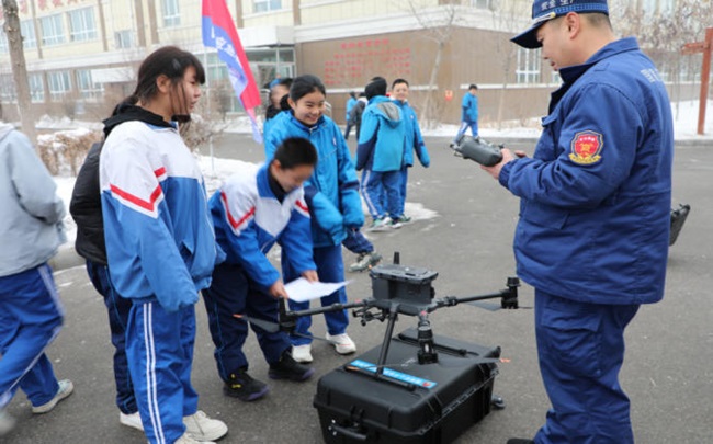 实操环节,指战员利用仿真模拟人演示心肺复苏、海姆立克急救法等操作,学生们轮流体验胸外按压、人工呼吸等急救要领,在实践中巩固所学技能。活动现场还展示了散射通讯系统、搜救无人机、生命探测仪等专业救援技术装备,激发了学生们对应急救援科技的浓厚兴趣。