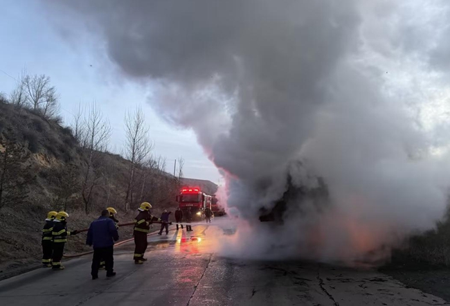 近日,陕西榆林府谷县老高川镇拉麻峰大桥附近一辆运煤车辆轮胎起火,国家矿山应急救援国能神东队迅速响应,成功扑救起火运煤车辆。