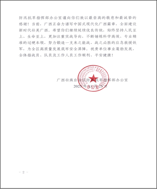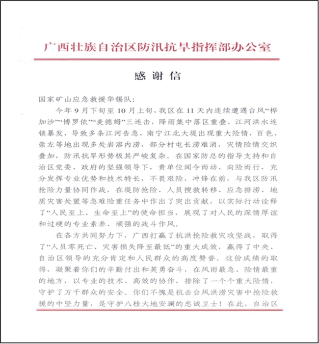 近日,国家矿山应急救援华锡队收到广西壮族自治区防汛抗旱指挥部办公室发来的感谢信,对华锡队在抢险救援中作出的突出贡献表示感谢。