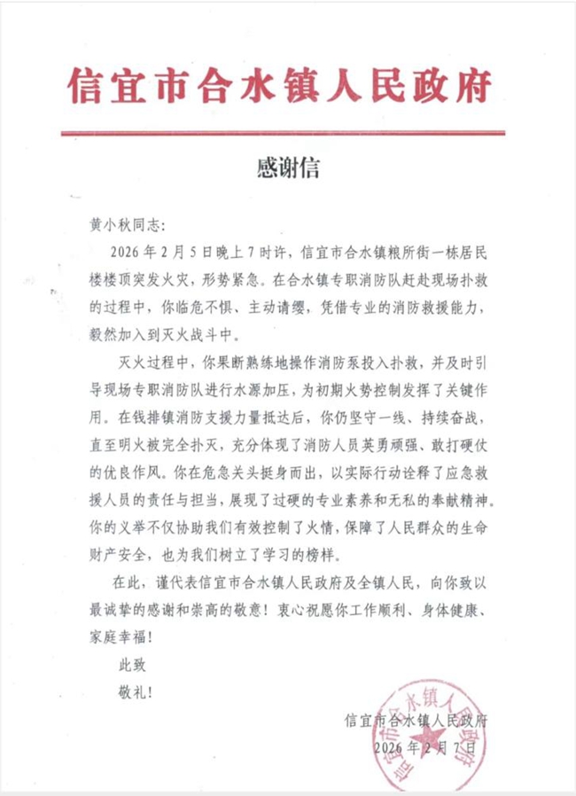 黄小秋同志临危不惧、主动作为,以专业能力化解险情,以责任担当守护安全,赢得了现场群众一致赞誉。信宜市合水镇人民政府专门致送感谢信,向黄小秋同志致以诚挚感谢和崇高敬意,称赞他以实际行动践行了应急救援人员的初心使命,切实保障了人民群众生命财产安全。