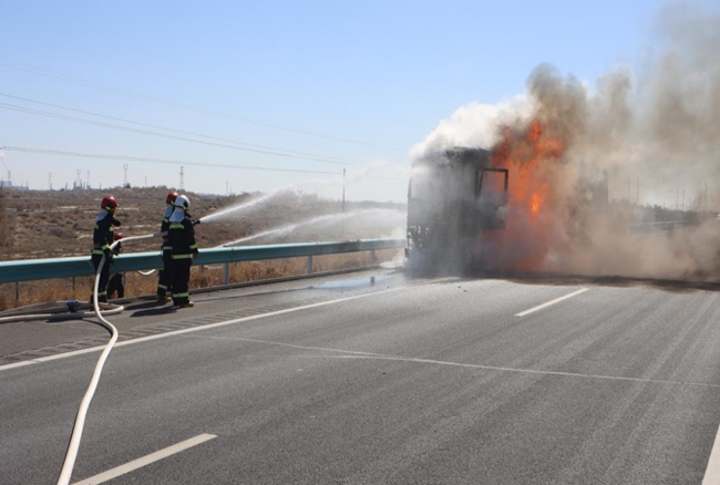近日,新疆维吾尔自治区奎阿高速某路段,一辆行驶中的货车突然起火,国家油气管道应急救援胜利油田队接警后,立即调派2车10人赶赴现场处置。