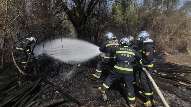 明火扑灭后,兰州石化队指战员架设水带干线,深入燃烧区域,对残留火点逐个清理。为防止枯木堆底部阴燃复燃,指战员还掀开堆垛底部,逐一排查暗火,确保不留隐患。经过近半小时的处置,兰州石化队确认现场无复燃可能后安全归队。