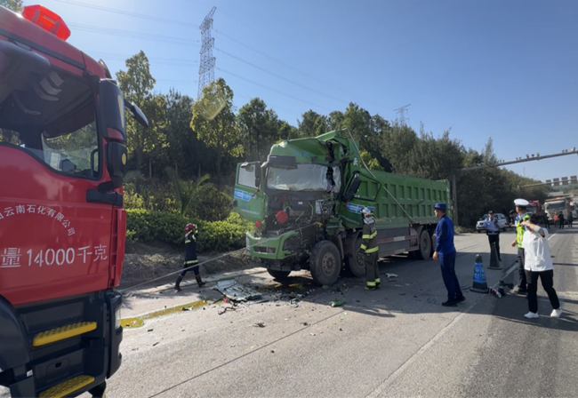 近日,国家危险化学品应急救援云南石化队驻地附近发生两辆重型货车追尾事故,造成后车驾驶室严重变形,驾驶员被困车内。云南石化队接警后迅速响应,调派3车13人赶赴现场开展救援。