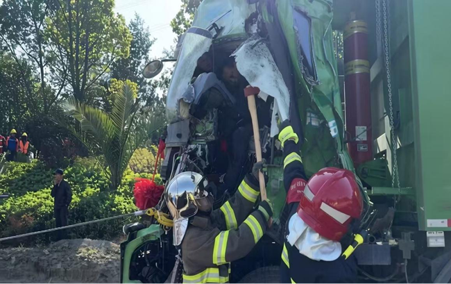 抵达现场后,救援人员经侦察发现,两辆重型货车发生追尾后,后车驾驶室被严重挤压变形,驾驶员下半身被困于驾驶座与方向盘之间。现场指挥员快速研判,制定救援方案。救援人员首先利用抢险救援车牵引装置,缓慢拉正变形车头、稳固车体,消除车体移位倾覆风险,随后运用电动液压顶杆支撑变形驾驶舱,有效拓宽救援作业空间,最后使用扩张器对驾驶员被困空间精准扩张,经过19分钟紧急施救,成功救出被困人员。此次救援任务圆满完成,队伍随后安全返程归建。
