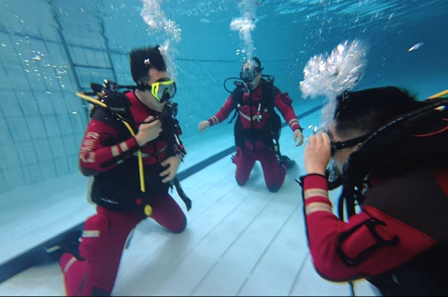 在潜水救援演练环节,队员严守操作规程,紧贴实战要求,开展潜水救援装备检查组装、水下救援作业、水下漂浮物释放等科目训练,同步强化水下姿态控制、水下目标锁定、水面指挥高效通联等实战技能。在水面舟艇救援演练环节,队员聚焦典型水域救援场景,开展摩托艇精准操控、极限绕标、落水人员快速施救、艇板联动救援等科目实操,有效提升了舟艇驾驶和协同救援能力。