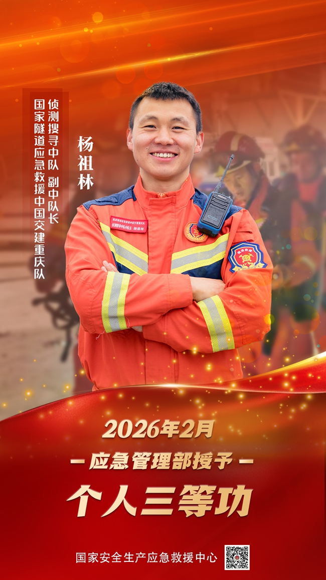 2025年6月17日,位于重庆市沙坪坝区的西渝高铁康渝段北中梁山隧道内突发一氧化碳溢出事故,多名施工人员被困。隧道救援重庆队接到指令后迅速启动应急响应。此时,杨祖林刚参加完一场应急演练,正整理清洗装备。听到警铃声,他火速赶往更衣室,迅速穿戴好战斗服及个人防护装备,携带氧气呼吸器、破拆工具等,跟随队伍赶往事故现场。到达现场后,根据上级调度指挥,杨祖林带领的队伍分成3个侦测小组,采取分批次轮换作业模式开展隧道侦察。面对复杂的现场环境,杨祖林主动请缨,作为第一批次小组的核心成员,成为首批挺进事故现场危险区域的救援人员。在浓烟弥漫、视线受阻的事故现场,高温热浪穿透厚重的战斗服炙烤着皮肤,杨祖林坚持在燃烧变形的台车下,手持生命探测仪搜寻被困人员,并使用气体检测仪等设备记录现场情况。现场随时可能发生二次坍塌和爆炸,杨祖林部署相关监测点,全程开展安全监护,尽可能全面地收集环境参数、事故细节等关键信息,用最快的速度反馈给现场指挥部,为专家制订救援方案提供重要依据。在坚守一线的4天时间里,杨祖林和队友先后二十余次进入事故现场开展实地侦测与风险处置。这些来自现场的真实数据,为营救出4名被困人员提供了有力保障。事后,杨祖林被应急管理部记三等功。