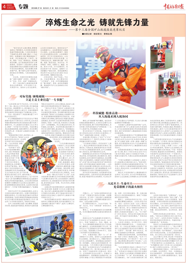 “我们去年参加了国际矿山救援技术竞赛。相比之下,本届全国矿山救援技能竞赛对作业规范的要求更高。因为操作规范是安全救援的前提。”国家矿山应急救援山东能源队大队长、本届竞赛裁判组副裁判长任晓东说。本届竞赛评分更为精准,裁判会综合考量完成速度、流程规范、技术细节、安全意识和团队配合等方面情况。“提前一分钟打通,对里面的人来说就会早一分钟被解救。所以在规定的时间内,用时越短,加分越多。但如果机械设备的操作不符合安全操作规程,就会被扣分。”国家隧道应急救援中铁二局昆明队总工程师、本届竞赛隧道组的裁判组组长王献泽说。精准化的评分看似苛刻,却能引导救援队伍在训练中追求效率的同时,将安全规范操作形成“肌肉记忆”,提升救援实战的安全性。